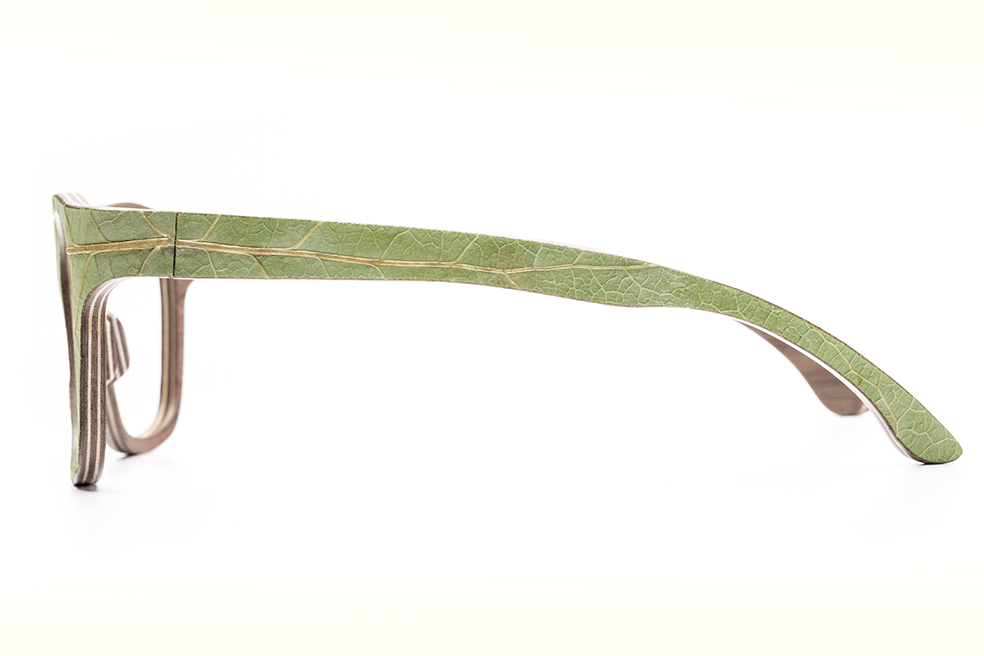 It was therefore decided to use the underside of the leaf, where the veins are more prominent, in order to highlight its beauty. A natural glue was chosen to apply the leaf to the eyewear and, likewise, a natural lacquer finish is used to prevent the leaf from drying and changing colour. The veins of the leaf, whose pattern is uninterrupted from the temple pieces to the frame front, are enhanced by a lacquer finish. The resulting eyewear is truly one of a kind since no leaf can be identical to another.